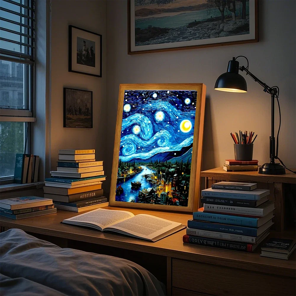Light Painting Picture Frame LED Night Light Moon Lamp, Van Gogh Starry Sky Wall Art, Oficina Bedroom Home Room Decor, Friend Gifts.